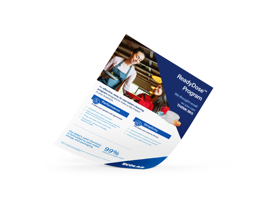 - ReadyDose™, an effective, easy-to-use tablet cleaning program designed to make a big impact. It delivers the clean guests expect and the clear uncomplicated routine staff want. ReadyDose tablets cover all your everyday cleaning needs, from the back of the kitchen to the front of the house, and every spot in between.